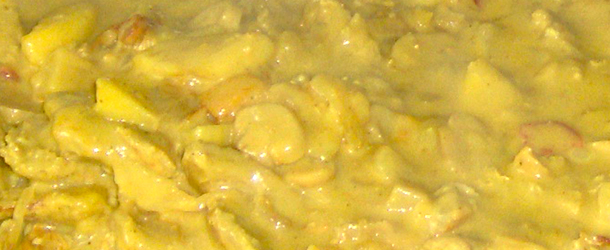 Saftige Hähnchenbrusthappen in cremiger, fruchtiger Mango-Kokossahnesauce, welche wir unter anderem mit Kardamom, Sternanis, Zitronengras und etwas Chili würzen.