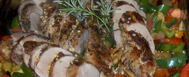 Würzig, saftig, lecker! Genießen Sie dieses duftende, mit Kräutern marinierte Schweinefilet auf mediterranem Gemüsebett. Wir tranchiertes das Filet und überstreuen es mit Mandeln.